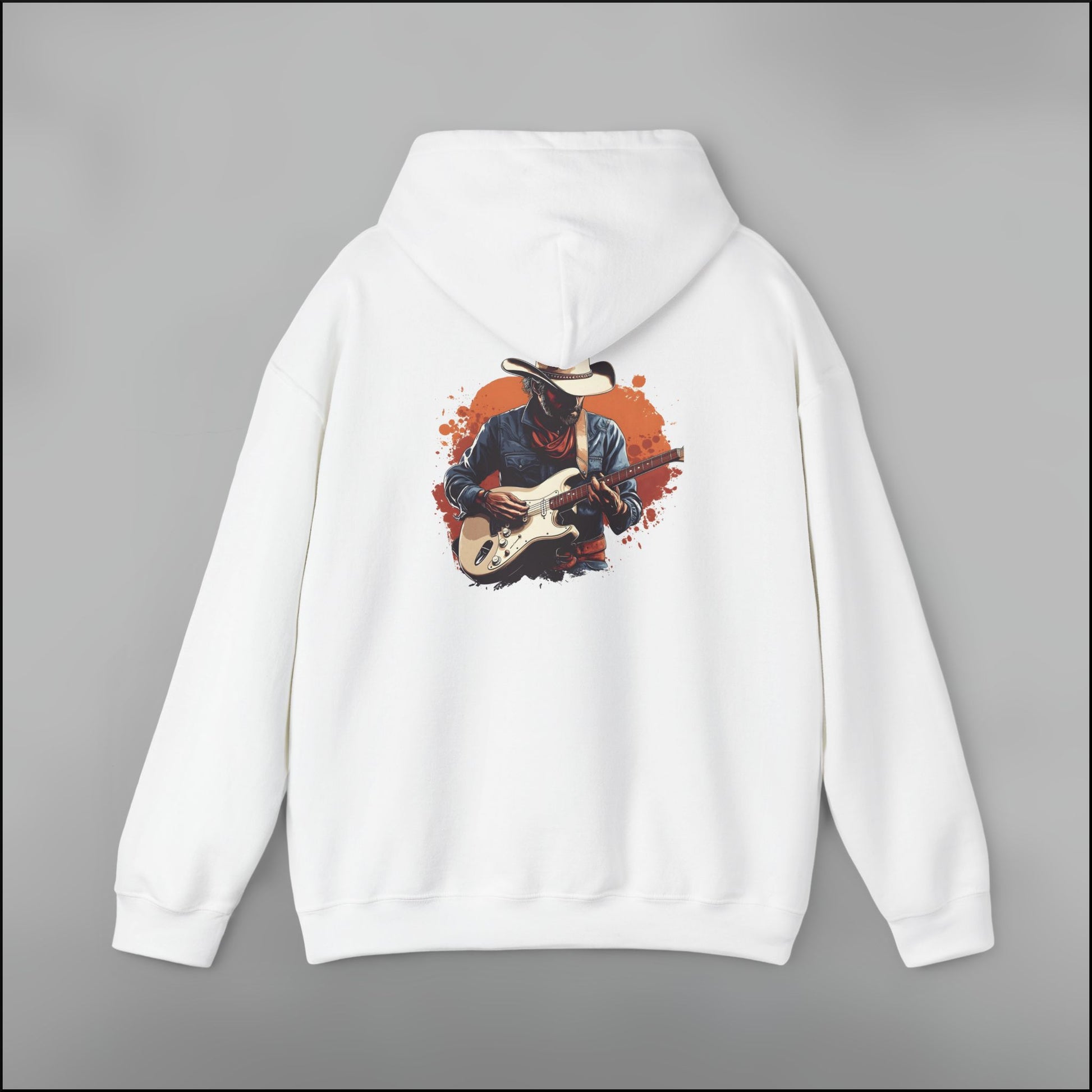 - Dynamic cowboy guitarist design with bold orange tones and outlaw attitude