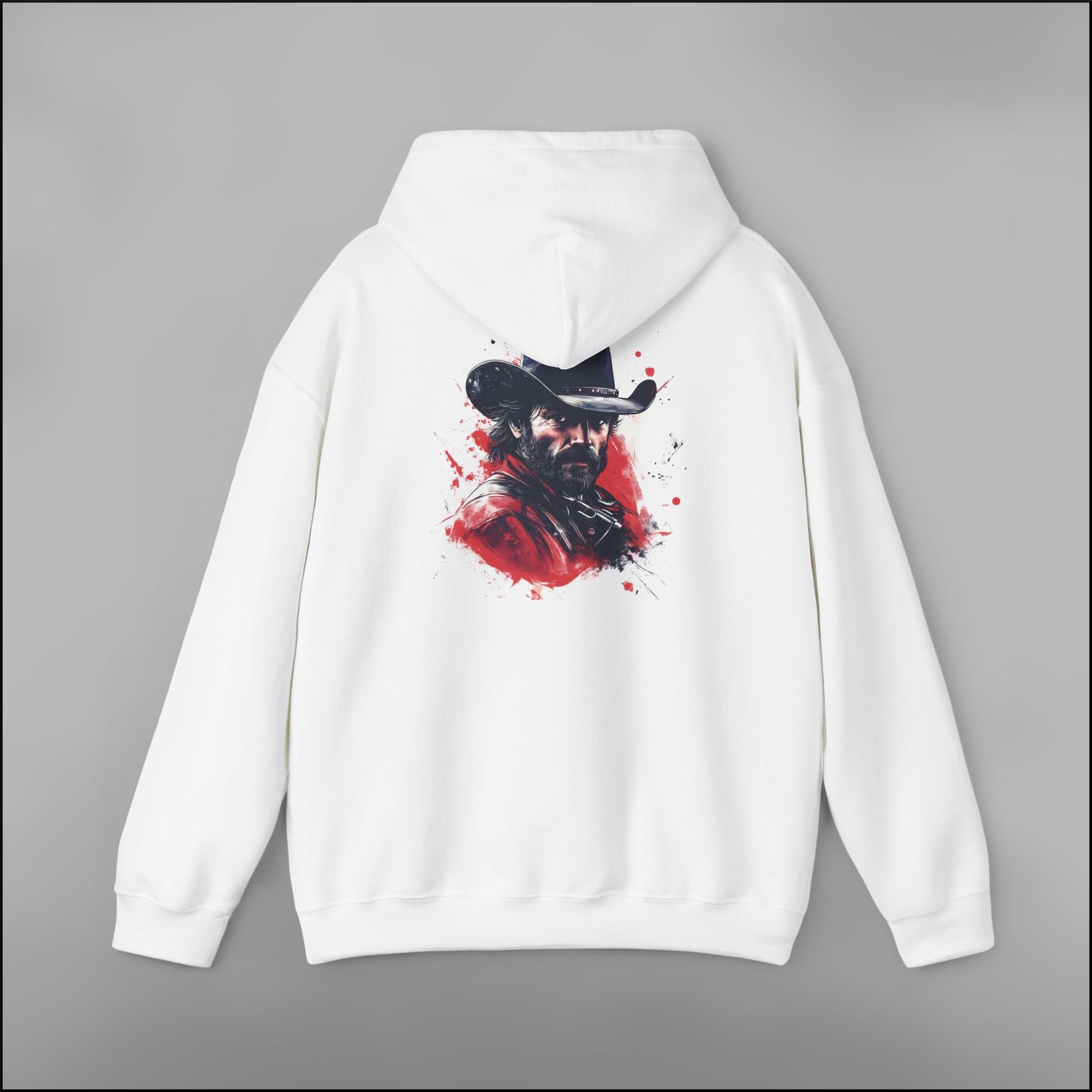 - Striking cowboy portrait with bold red tones—classic standoff energy in modern brush style