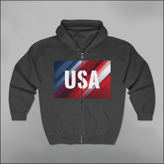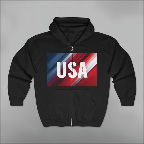 - Striking diagonal USA graphic with kinetic color flow and zip-front impact